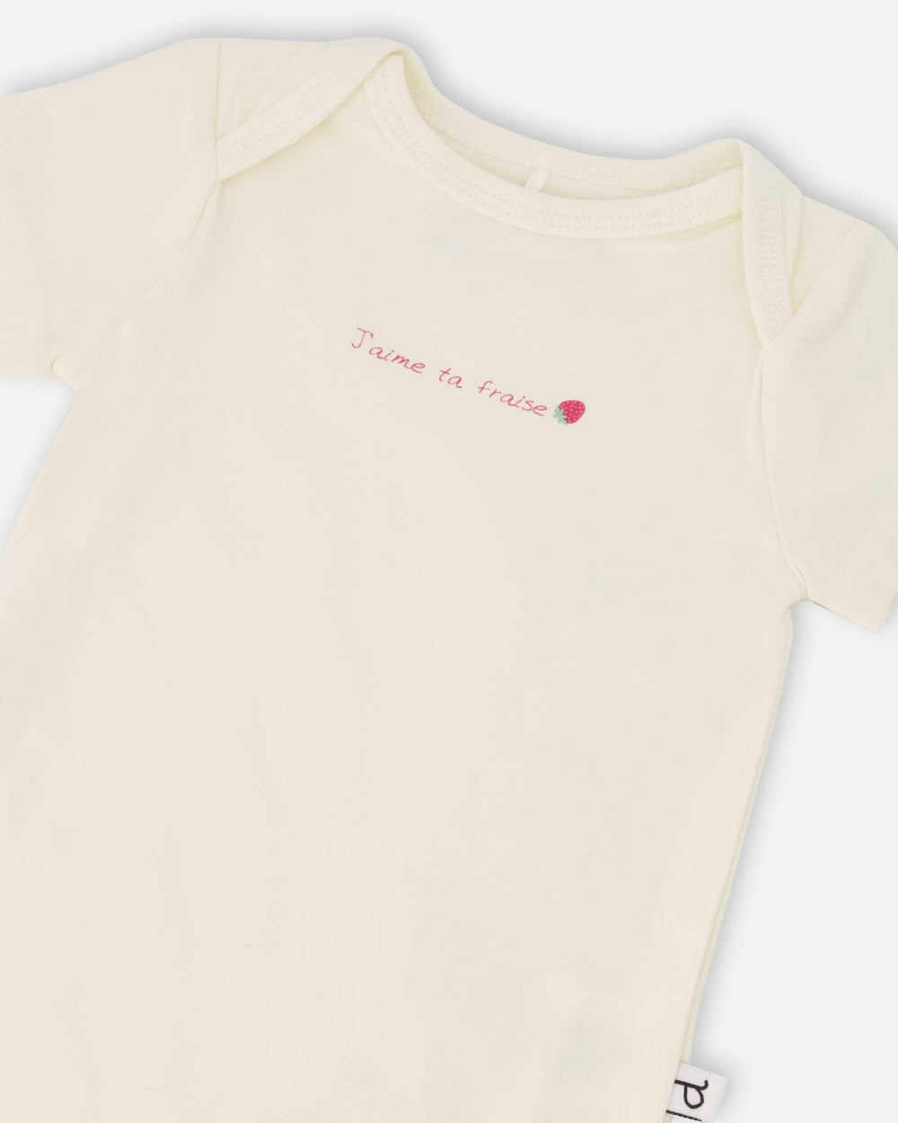The evolutive organic cotton jersey onesie white is a sweet everyday essential for baby girls. This short-sleeve bodysuit features an envelope neckline for easy changes, bottom snap closures, and a delicate printed message on the chest. The leg snap button closure is evolutive to adapt as she grows. Crafted from soft organic cotton with a touch of stretch, it ensures breathability and comfort throughout the day. Perfect for naps, playtime, or layering under dresses and overalls, this piece blends practicality with gentle charm. A lovely addition from our "Blueberry Cuddles" collection to brighten the season.