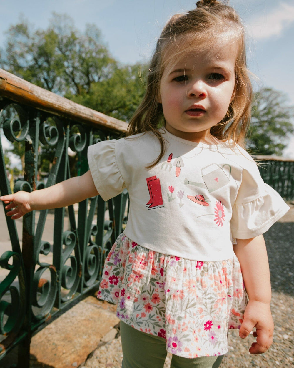 Our organic cotton jersey capri light khaki green is a comfy essential with a playful twist. This slim fit design features an elastic waistband, a cropped length, and delicate floral print along the bottom hems. Crafted in soft organic cotton with added stretch, it’s perfect for girls and baby girls, easy to pair with other pieces from our "Little Meadow" collection.