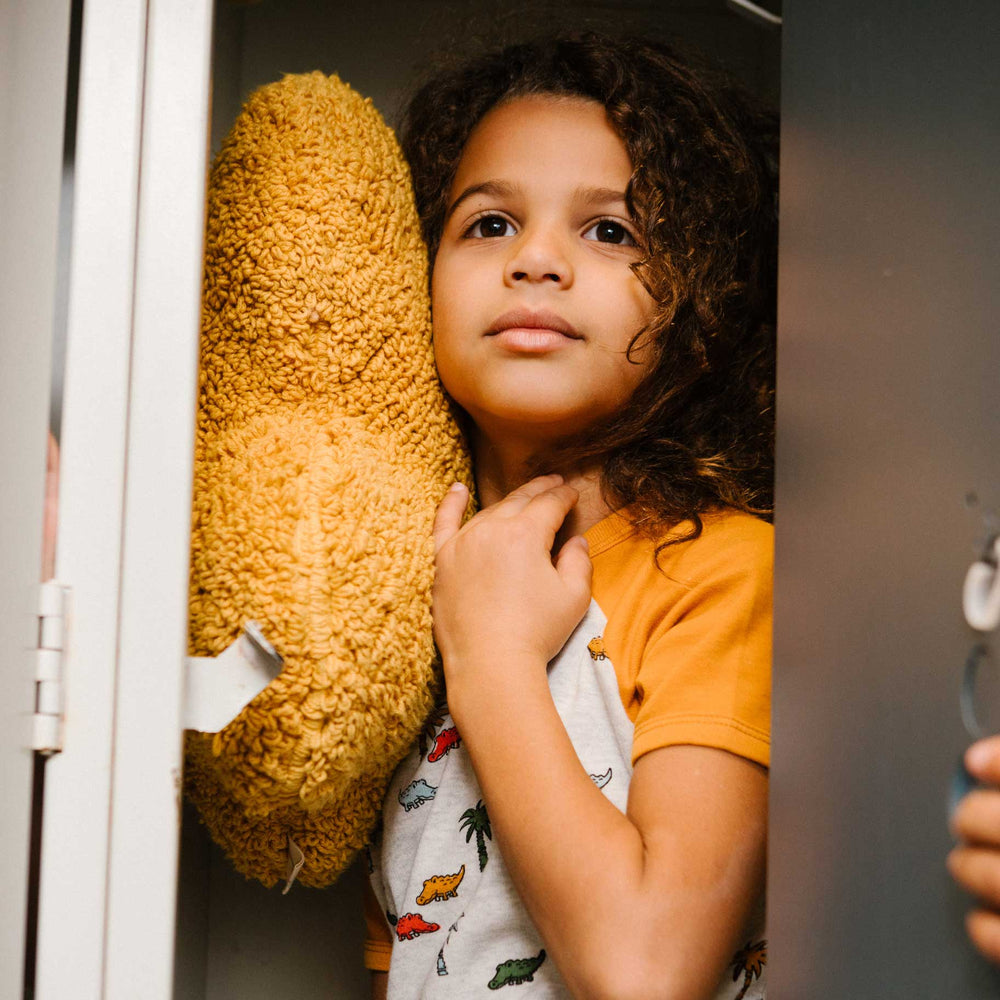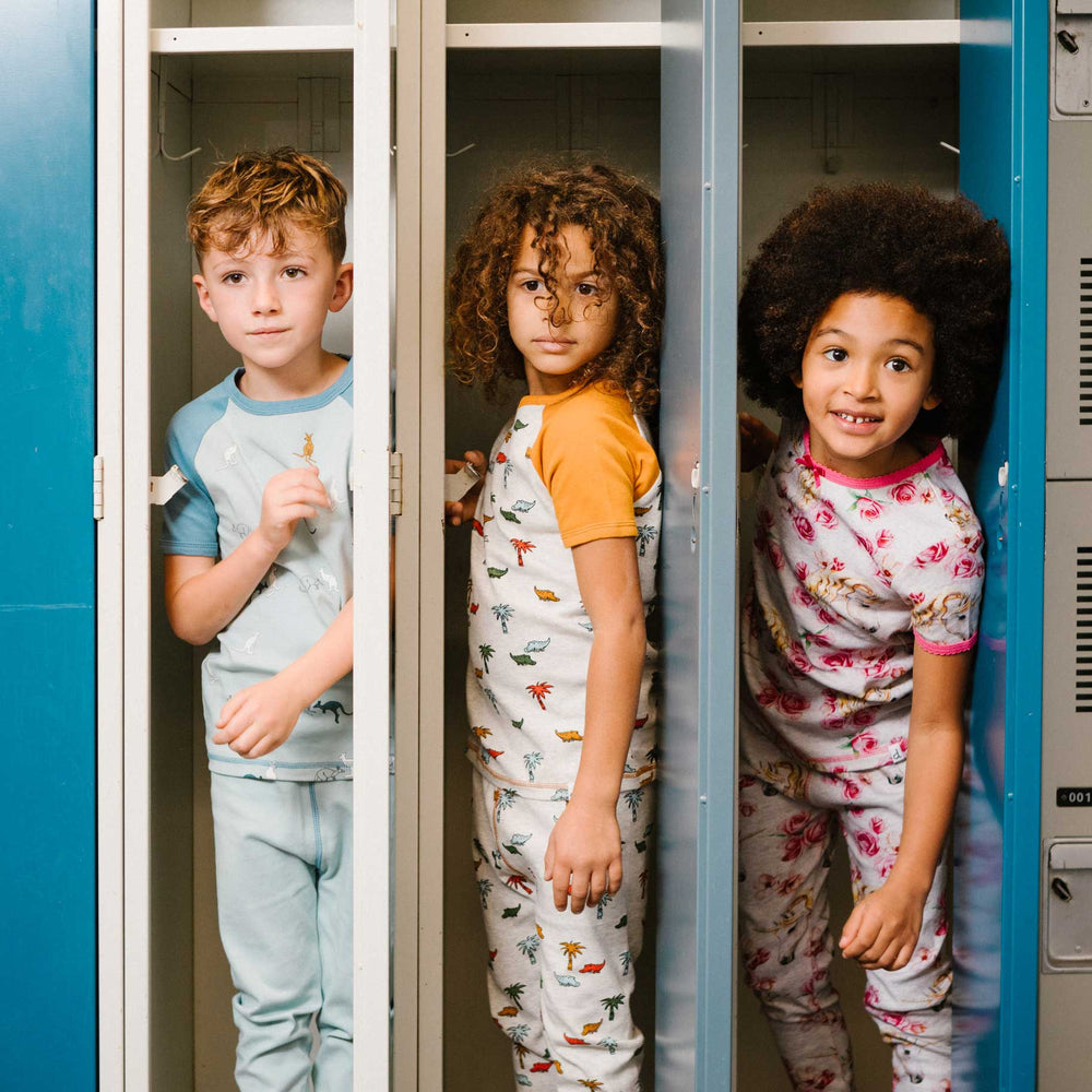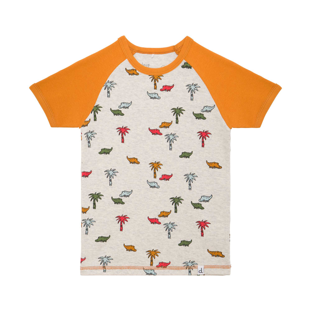 Featuring a crocodile and palm tree print, this pajama set makes bedtime more stylish and more comfy. Our Organic Cotton Two Piece Pajama Set Oatmeal Print features a short raglan sleeve top with solid sleeves, an allover print body, and a crew neckline. It's teamed with an allover print pant with solid cuffs and a extensible elastic waistband.