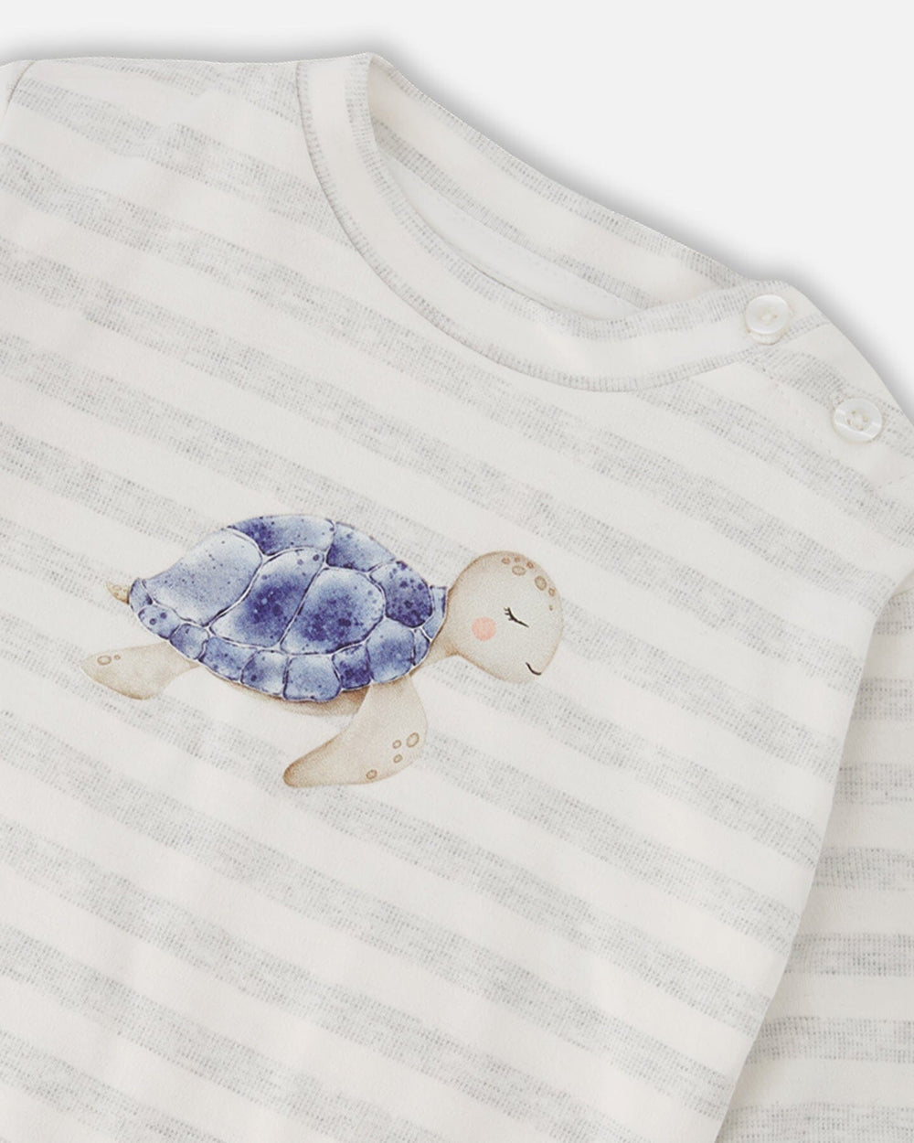 Playful and comfy, our soft jersey sweater and pants set with white and grey stripes is made for everyday adventures. The striped top features buttons at the shoulder and a sweet turtle print on the chest, while the matching pants offer a relaxed fit with an elastic waist and side pockets for practicality. Crafted in breathable cotton, this duo is perfect for keeping little boys cozy and stylish all season long.
