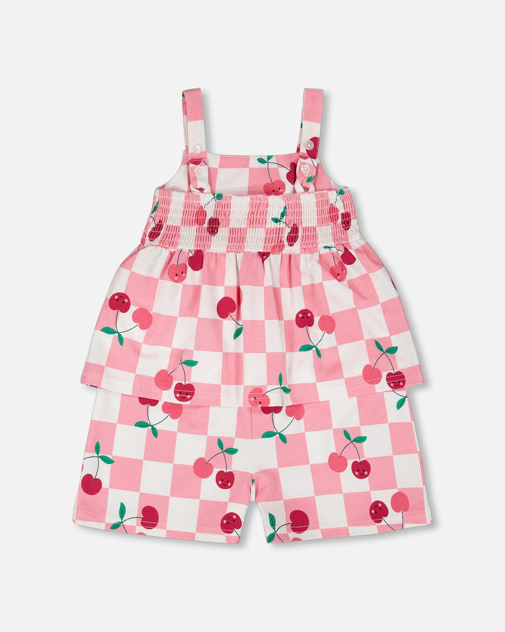 This organic cotton jersey romper in pink with printed cherries is a sweet and playful choice for sunny days. This one-piece features a pink and white check pattern adorned with allover cherries, with slender straps and a flounce overlay for extra charm. Made with soft organic cotton and a hint of stretch, it combines breathable comfort and cheerful style in our “Cherry On The Check” collection.