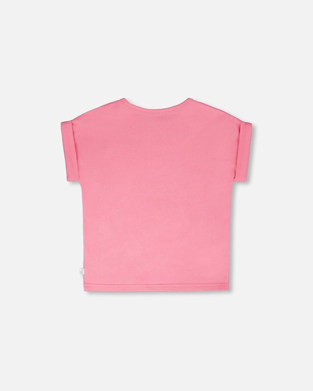 Our organic cotton jersey t-shirt in pink is a cheerful summer staple with a playful vibe. This top features a round neckline, short sleeves with folded cuffs, and a charming front print of a beach chair under an umbrella with seaside details. Soft and stretchy for all-day comfort in organic cotton, this tee is easy to coordinate with bottoms from our "Blue Horizon" collection.
