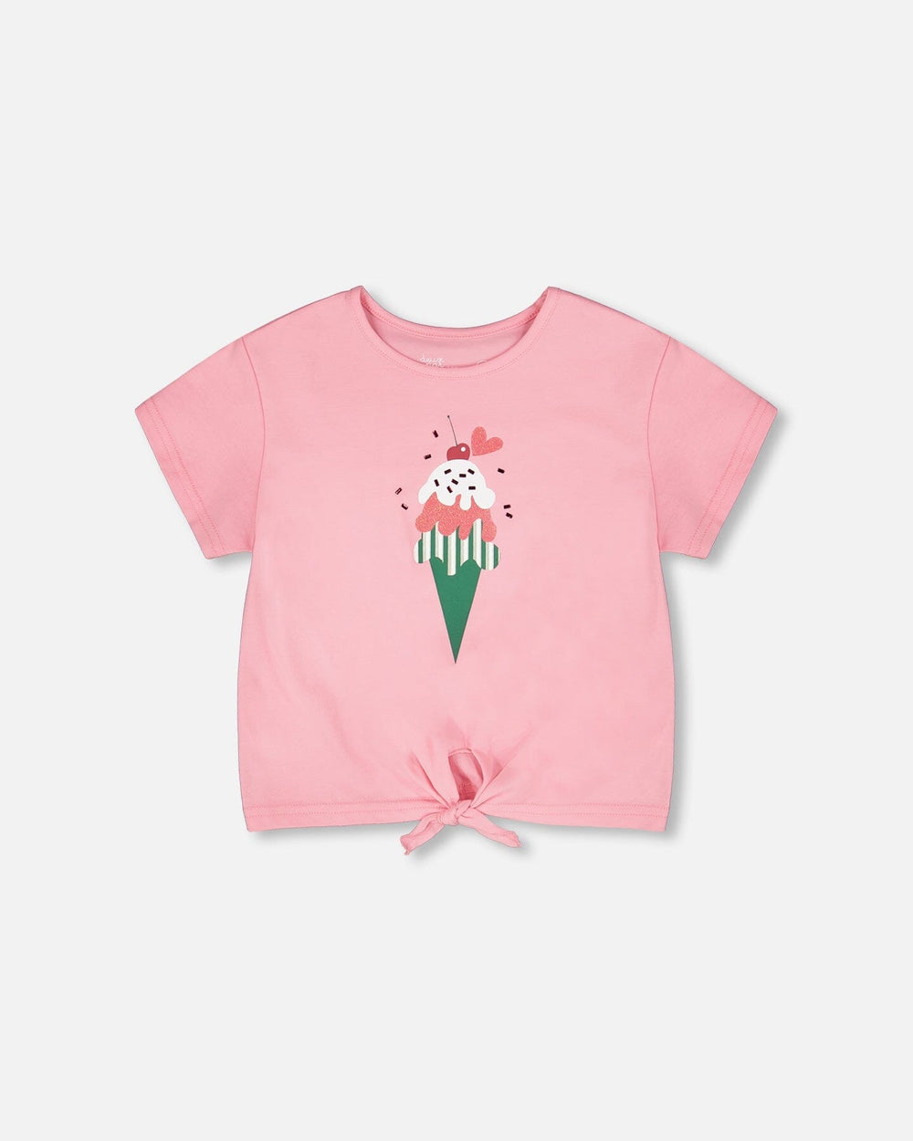 This organic cotton jersey t-shirt with tie at waist pink is playful and sweet. This top features a round neckline, an ice cream print at the front, short sleeves, and a knotted tie detail that adds a fun finish. The organic cotton fabric with a hint of stretch makes it soft, breathable, and easy to wear, perfect for the “Cherry On The Check” collection.