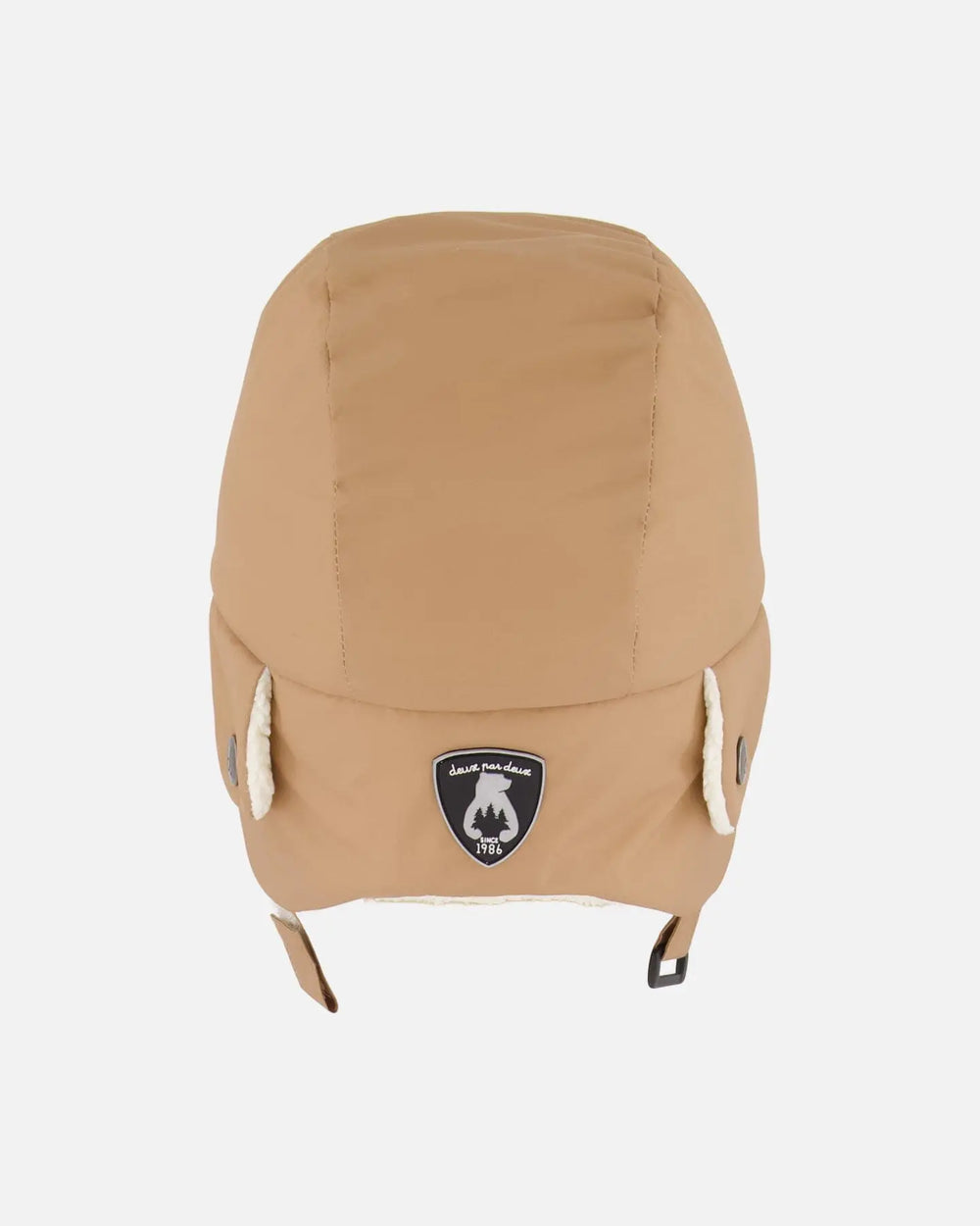 Made for the coldest days of the year, this winter hat for babies fully protects little heads, ears, and cheeks. Lined with sherpa fabric that makes it ultra-warm, this chapka features ear flaps that cover the cheeks, a strap that attaches under the chin, and a small logo patch in back.