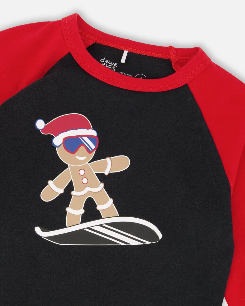 In super soft interlock fabric, this organic cotton sleepwear set is made for cozy nights and comfy mornings. A must-have for the boy with a playful sense of style, these pajamas feature a long sleeve crew neck top with contrast raglan sleeves, a pull-on pant with a stretchy elastic waistband, and an eye-catching snowboarding gingerbread man print..