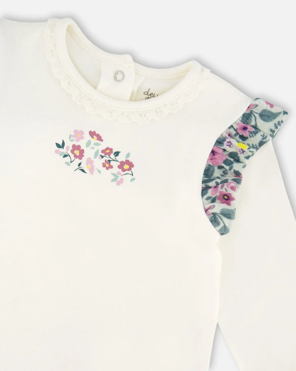 Soft and airy, our Organic Cotton Off-white Top and Muslin Pants Set offers effortless comfort. The long-sleeve interlock t-shirt features a relaxed fit with delicate floral gathers, while the lightweight muslin pants boast an elastic waistband for easy wear and a charming floral pattern. A cozy and stylish duo for little ones on the move.