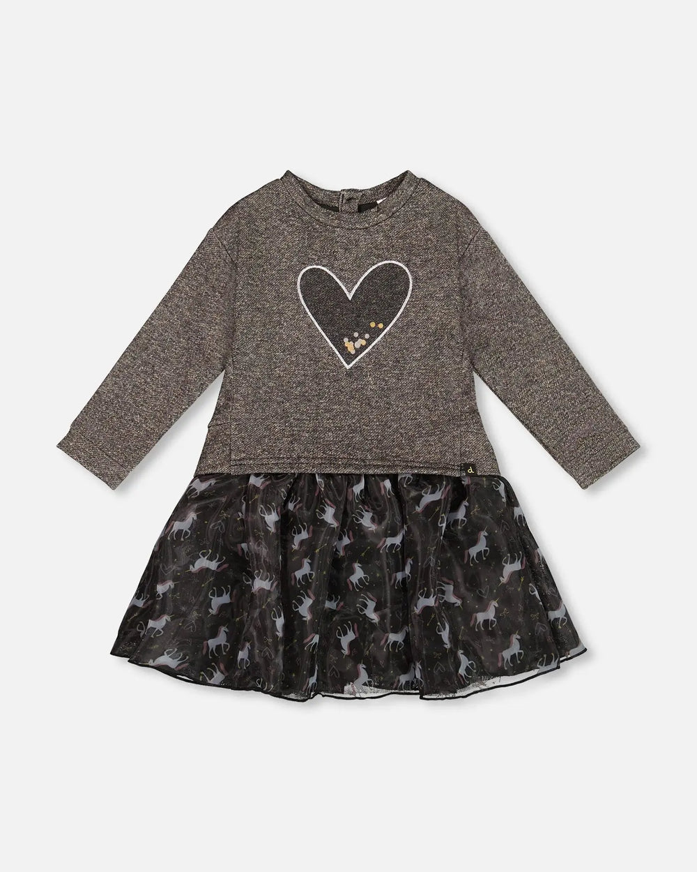 Give your little one a chic and playful look with this girls’ black heart dress with mesh skirt. Designed with a cozy sweatshirt-style top and a shimmery unicorn-print mesh skirt, it’s the perfect balance of comfort and style.