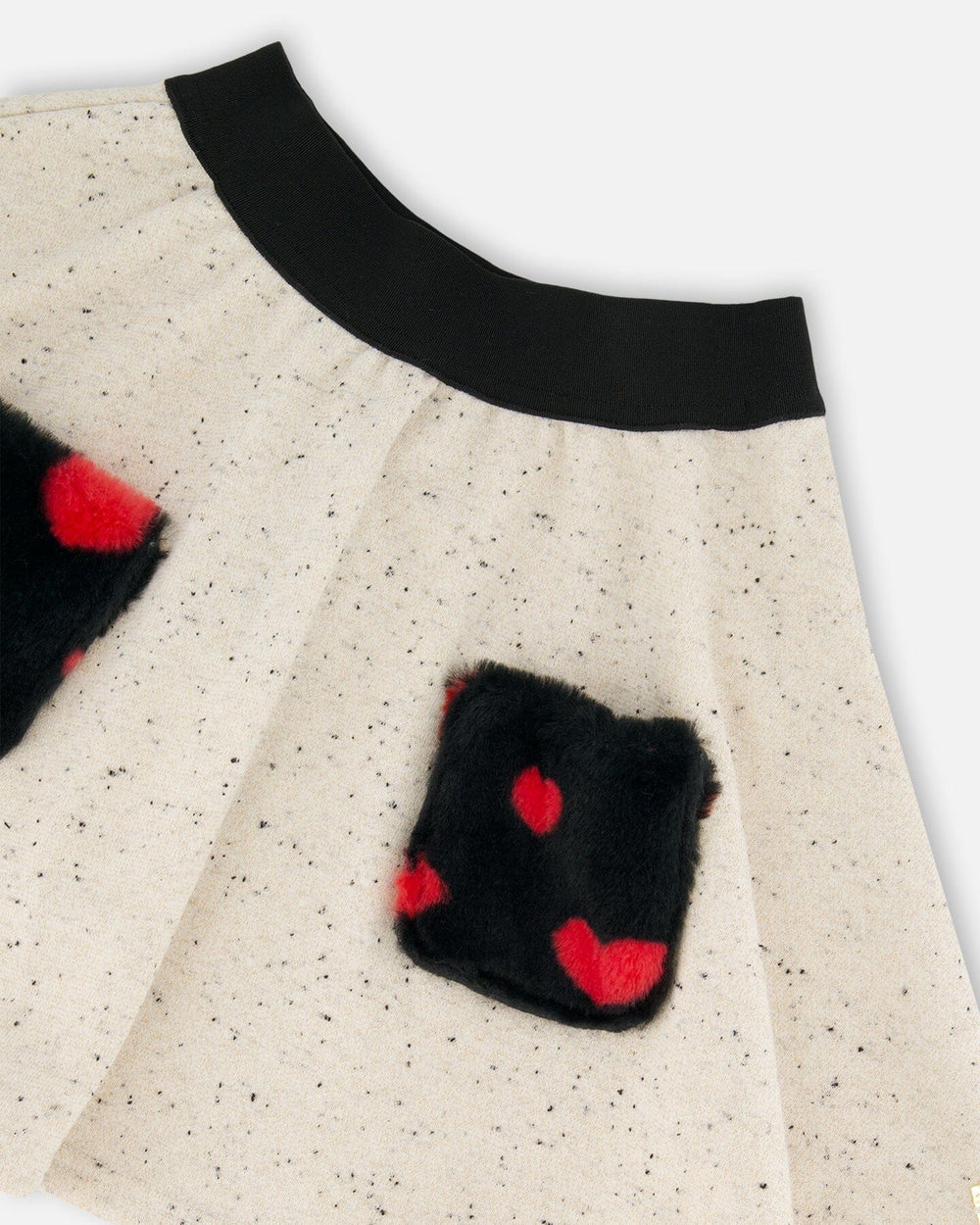 This French Terry Skirt in Beige and Black adds a playful twist to her wardrobe. Made from a soft french terry fabric with a touch of faux fur, this flared skirt features a comfortable fit with the right amount of stretch. The combination of beige, black, and pink makes it easy to pair with any top for a fun, fashionable look. The two front pockets in faux fur, adorned with a cute heart pattern, add a sweet and stylish detail to this piece. Perfect for playdates or casual outings, this skirt will keep her looking cute and feeling comfy all day long.