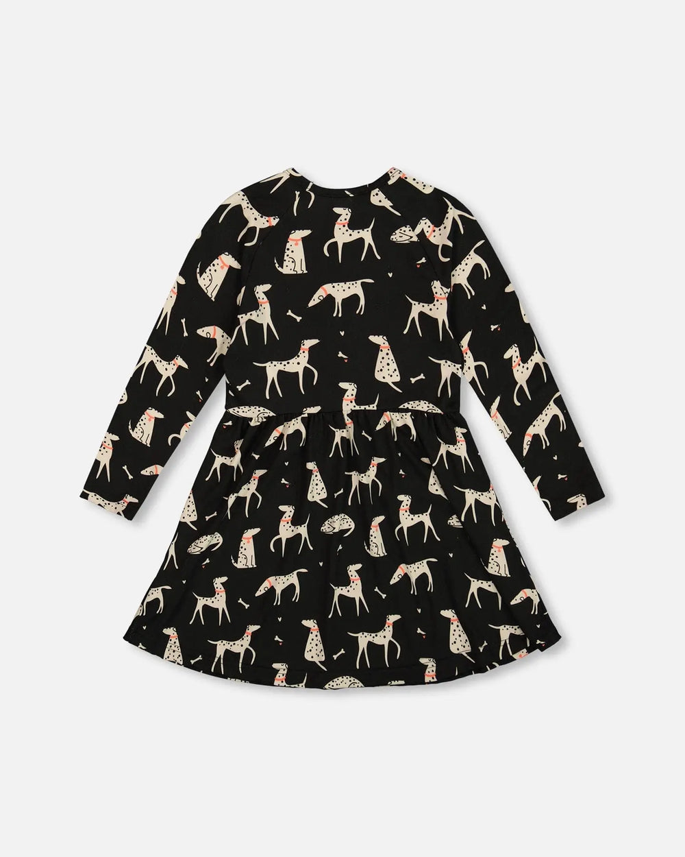 With its playful spirit and bold character, the Half Button Jersey Dress in Black Dalmatian Print brings everyday charm to young girls’ wardrobes. This jersey dress features front buttons, long raglan sleeves, a round neckline, and a gathered waist, all dressed in an allover dalmatian dog pattern. Finished with two black shiny heart-shaped front pockets, it’s a sweet pick for school days, parties, or puppy-filled daydreams.