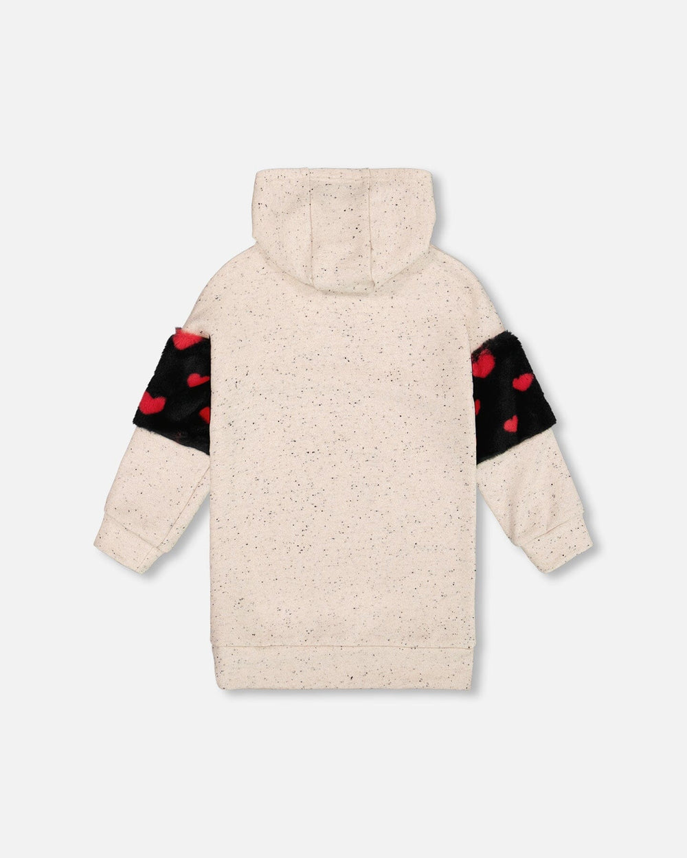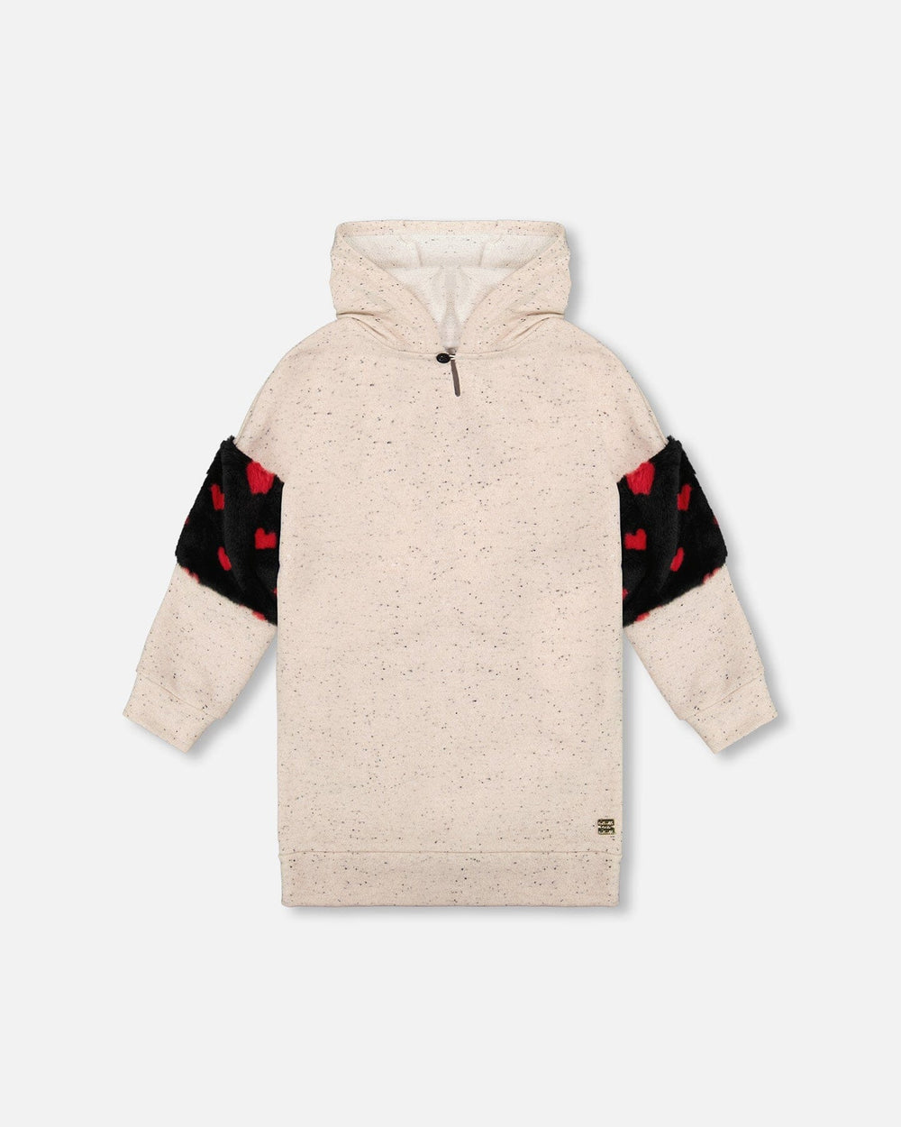 Playful and full of flair, the Hooded French Terry Dress Beige With Heart Bag is a standout piece for stylish young girls. This sweater dress features a roomy hood, a lurex french terry beige body, and long sleeves with a bold faux fur sleeve section with a pink and black heart pattern for a fun contrast. Designed with a sewn-on black heart-shaped bag, it’s made for twirling through fall adventures in total comfort.