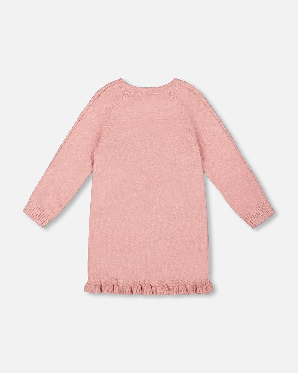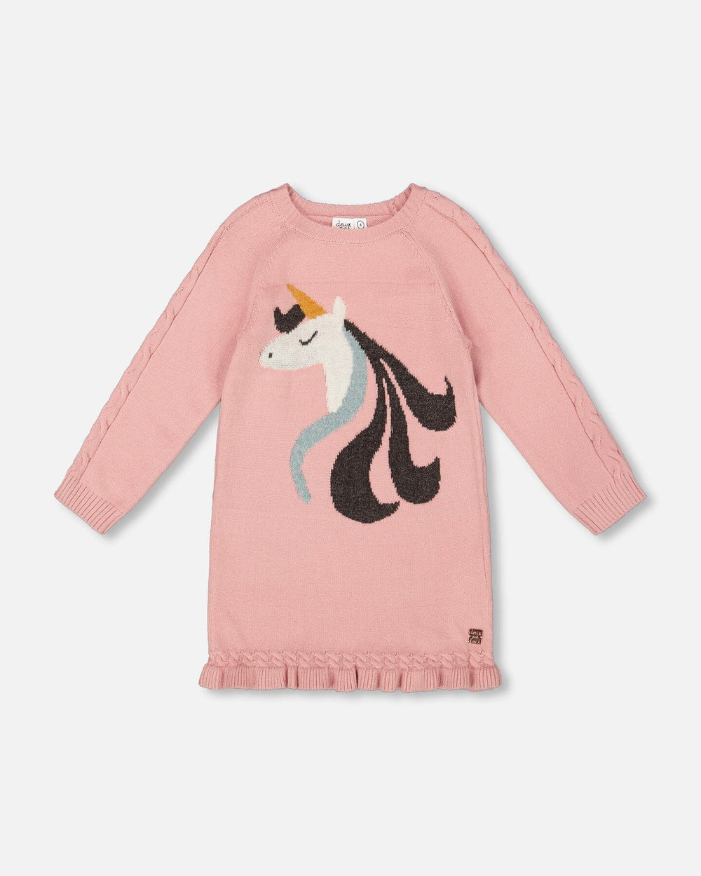 The Knitted Dress in Dusty Pink With Unicorn Intarsia brings charm and softness to any fall wardrobe. Made from a cozy knit blend, this sweater dress features long raglan sleeves in a textured knit, a large jacquard unicorn with glittery details on the chest, ribbed trims, and delicate ruffles at the bottom hem for extra flair. Its easy pull-on fit makes this dress perfect for school days, weekend fun, and everything in between.