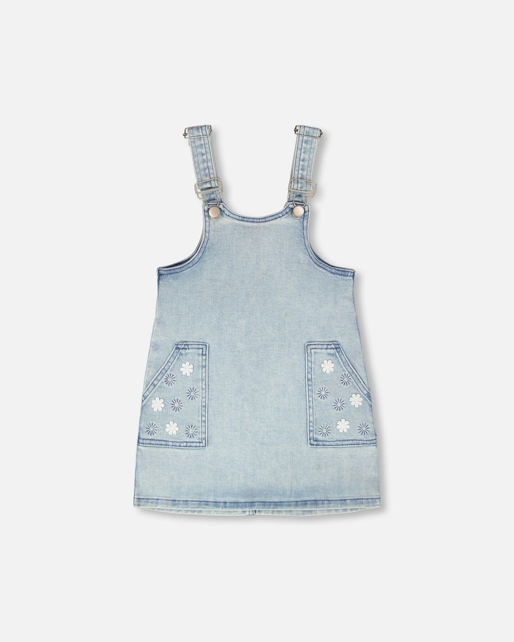 Casual yet chic, our light blue denim overall dress is a versatile piece for playful days. This sleeveless dress features adjustable buckle straps, front patch pockets with embroidered daisies, and a straight cut for effortless layering. Part of the “Explosion of Daisies” collection, it pairs beautifully with any tee or blouse from the line.