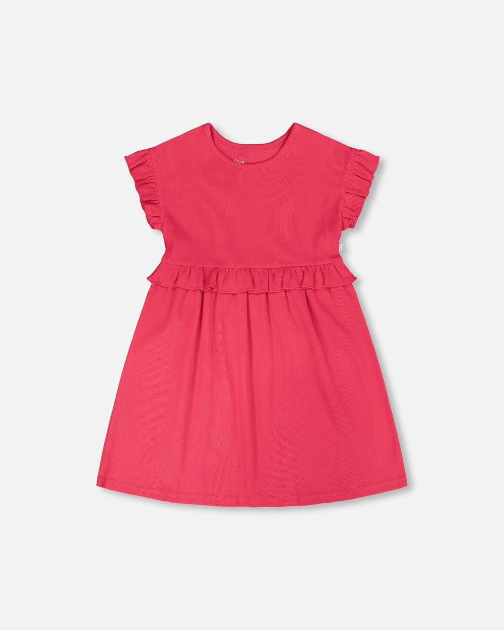 The cotton rib dress in pink is a sweet and simple piece with playful charm. This dress features short ruffled sleeves, a gathered frilled waist, and a softly flared skirt for everyday comfort. Made from a cotton-rich rib fabric with added stretch, it coordinates beautifully with the rest of our “Cherry On The Check” collection.
