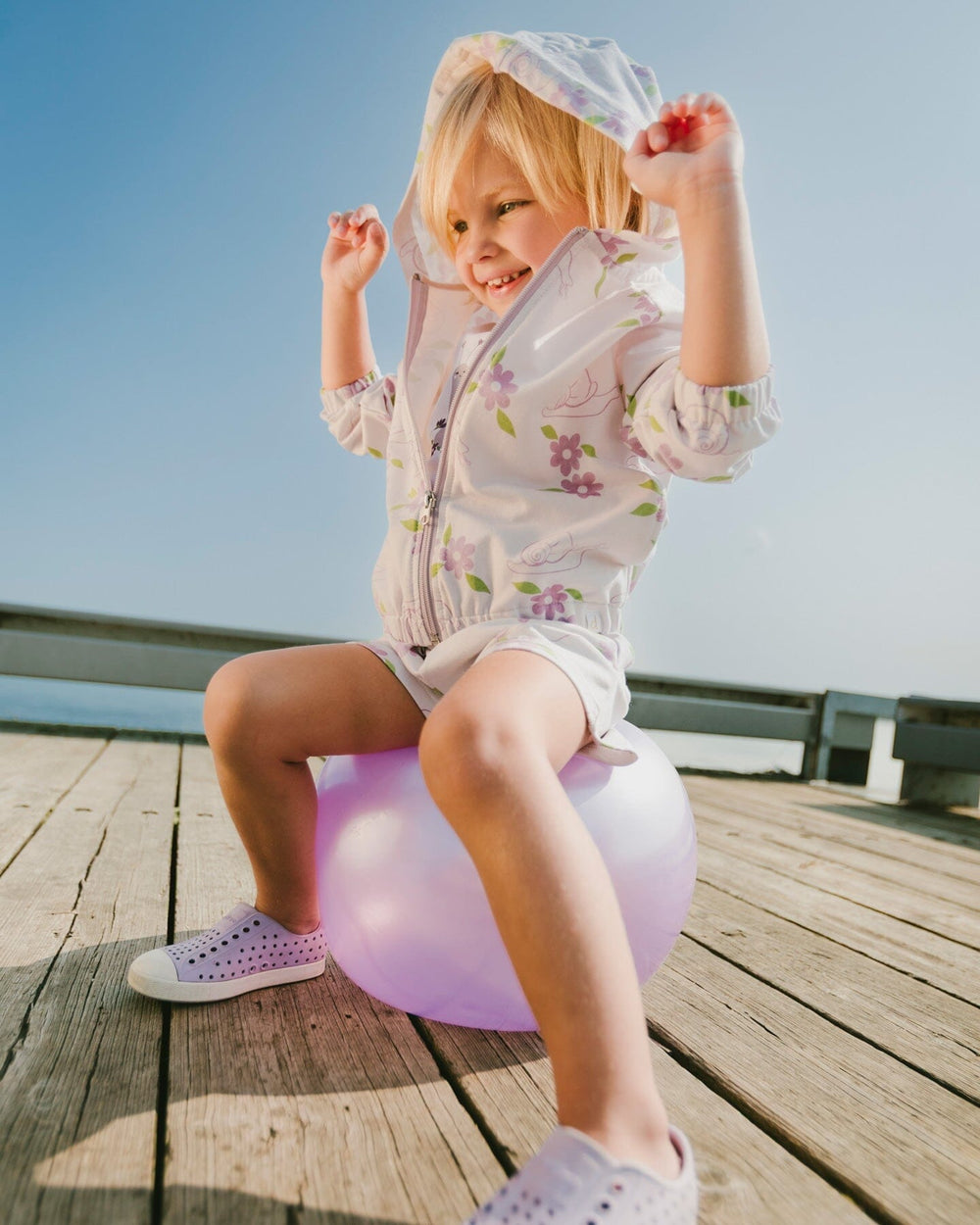 Playful charm meets cozy comfort in this French terry hooded cardigan lilac with snails print. Designed in soft cotton French terry, this hooded zip-up cardigan features a whimsical allover snail and floral print, raglan sleeves, and practical elastic trims for a snug fit. A versatile layer, it’s ideal for cool spring outings and pairs perfectly with other pieces from our Clovers And Violets collection.