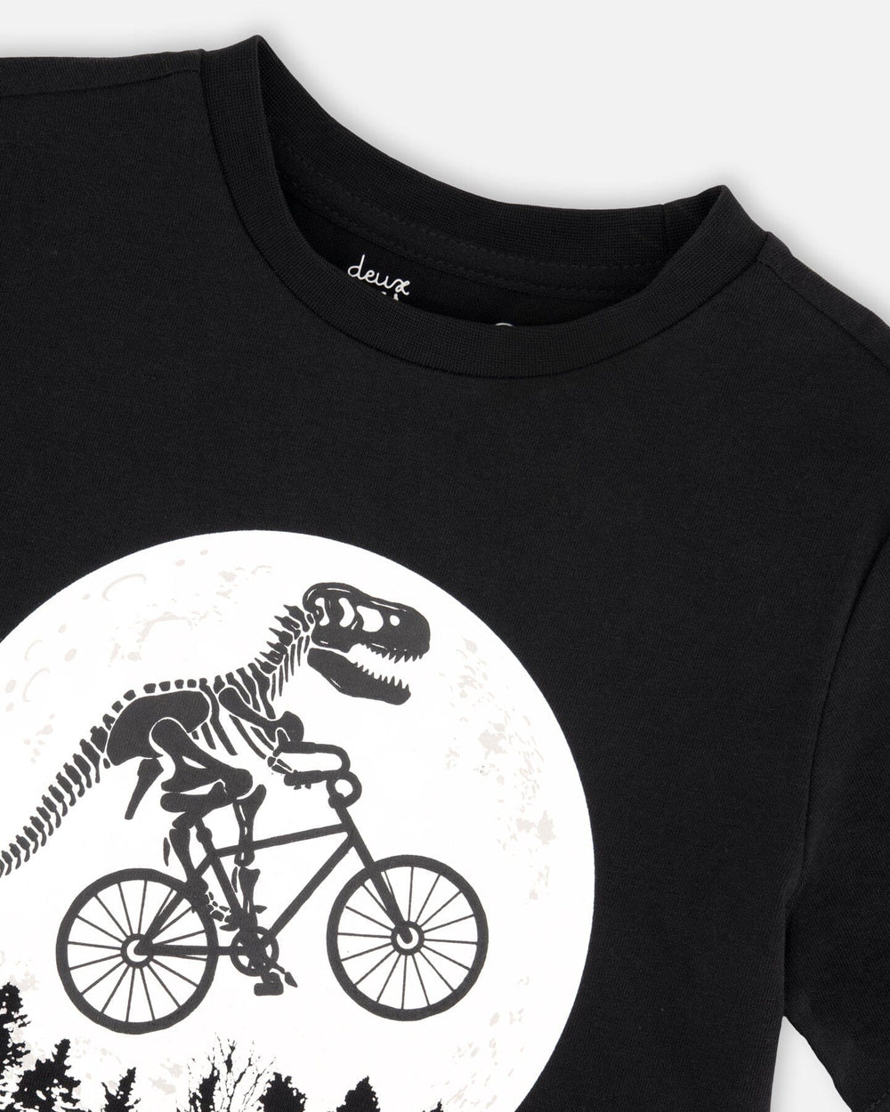 Organic Cotton Jersey T-Shirt With Dino On Bike Print Black