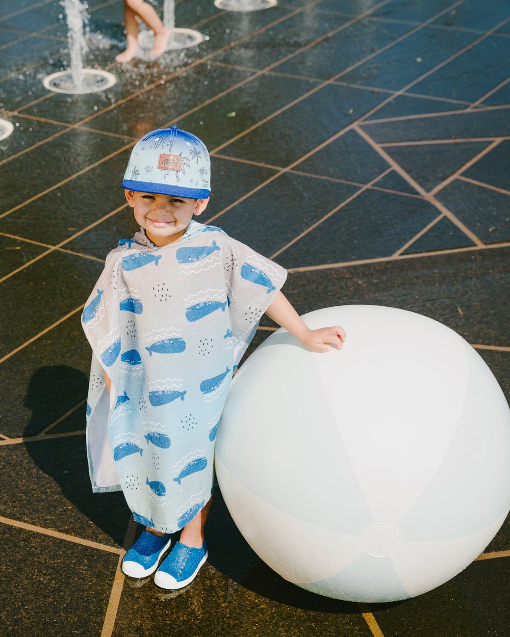 Wrap up the fun after a swim with this hooded beach towel in blue with whale print, designed to keep kids cozy and dry. This beach accessory is covered in an allover whale motif on a blue gradient background, which brings a playful ocean vibe, while the attached hood adds extra warmth and coverage. Made from soft polyester, it’s lightweight, absorbent, and easy to pack for every seaside adventure.