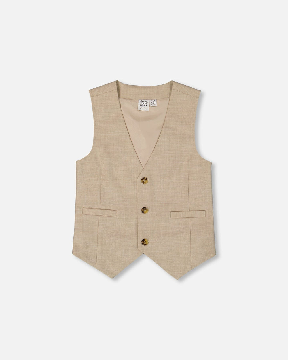 This elegant vest in beige is the perfect finishing touch for a refined look. Designed with a classic V-neckline, button-front closure, and welt pockets, this vest balances timeless style with modern comfort. Fully lined for a smooth fit, it is ideal for layering over shirts to elevate any special occasion outfit.