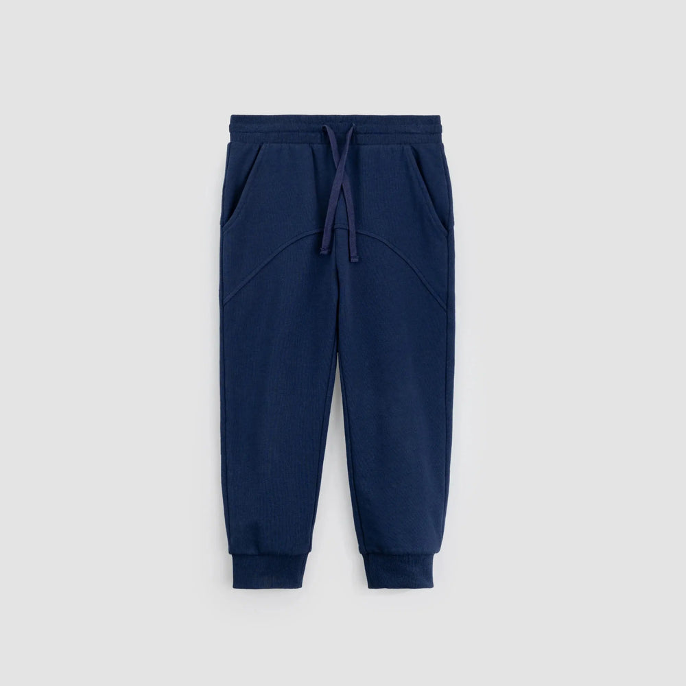 These navy joggers have a dropped hem to create a cool, sporty style. With an elasticated waistband and drawstring tie, the joggers are comfy and supportive for all day wear. Made from organic cotton with French Terry, the joggers are flexible and breathable – perfect for kids always on the move.