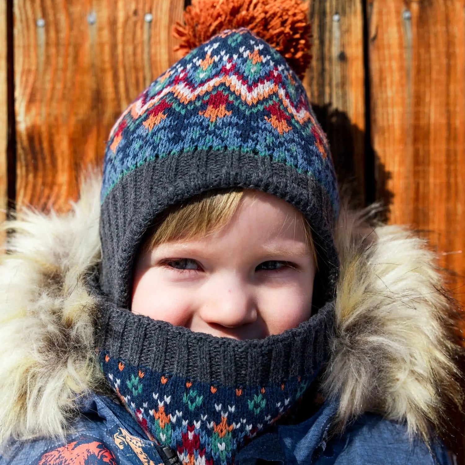A ski-inspired pattern lends classic charm to this cozy Jacquard Knit Necktube Grey, Blue and Brown. This infinity necktube is made from a poly/acrylic/wool/viscose blend and features solid rib knit trim with a round logo patch on the front.