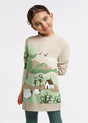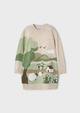 Knit Girls Dress: Cream basic colored knitted tunic, dress. The front is decorated with a cottage, lambs and trees. Wonderful autumn burgundy and pink shades make it unique.