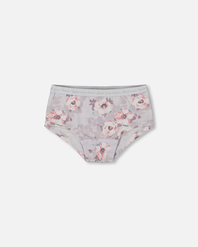 Our Printed Organic Cotton Boyshort Panty Pale Pink Flowers on Neutral Lilac is a must-have in every little girl's wardrobe. Ultra-soft and stretchy, this panty features a pretty allover floral print in a comfy silhouette with a signature logo print elastic waistband.