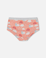 Our Printed Organic Cotton Boyshort Panty Rainbow on Light Coral is a must-have in every little girl's wardrobe. Ultra-soft and stretchy, this panty features a whimsical moon, cloud, and rainbow print in a comfy silhouette with a signature logo print elastic waistband.