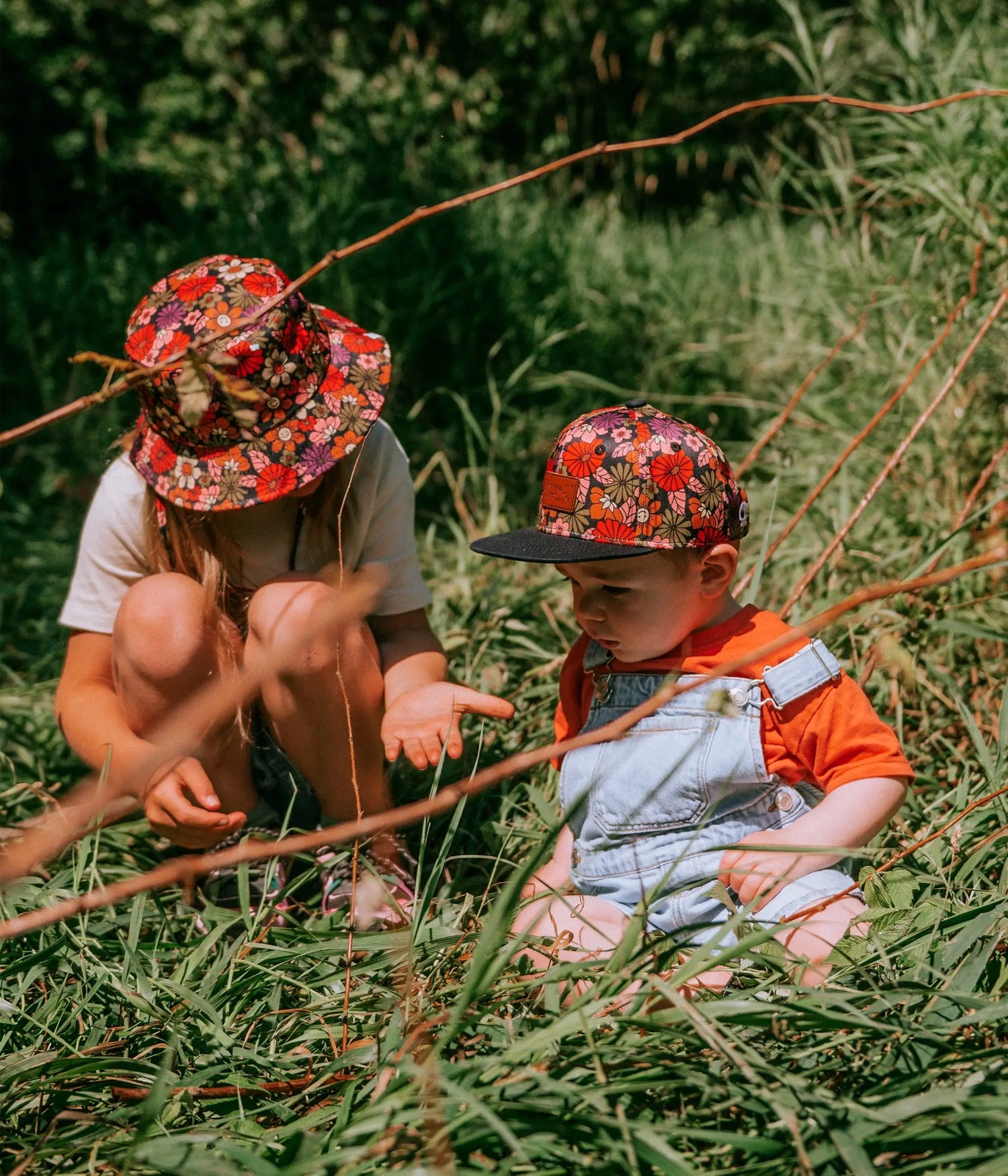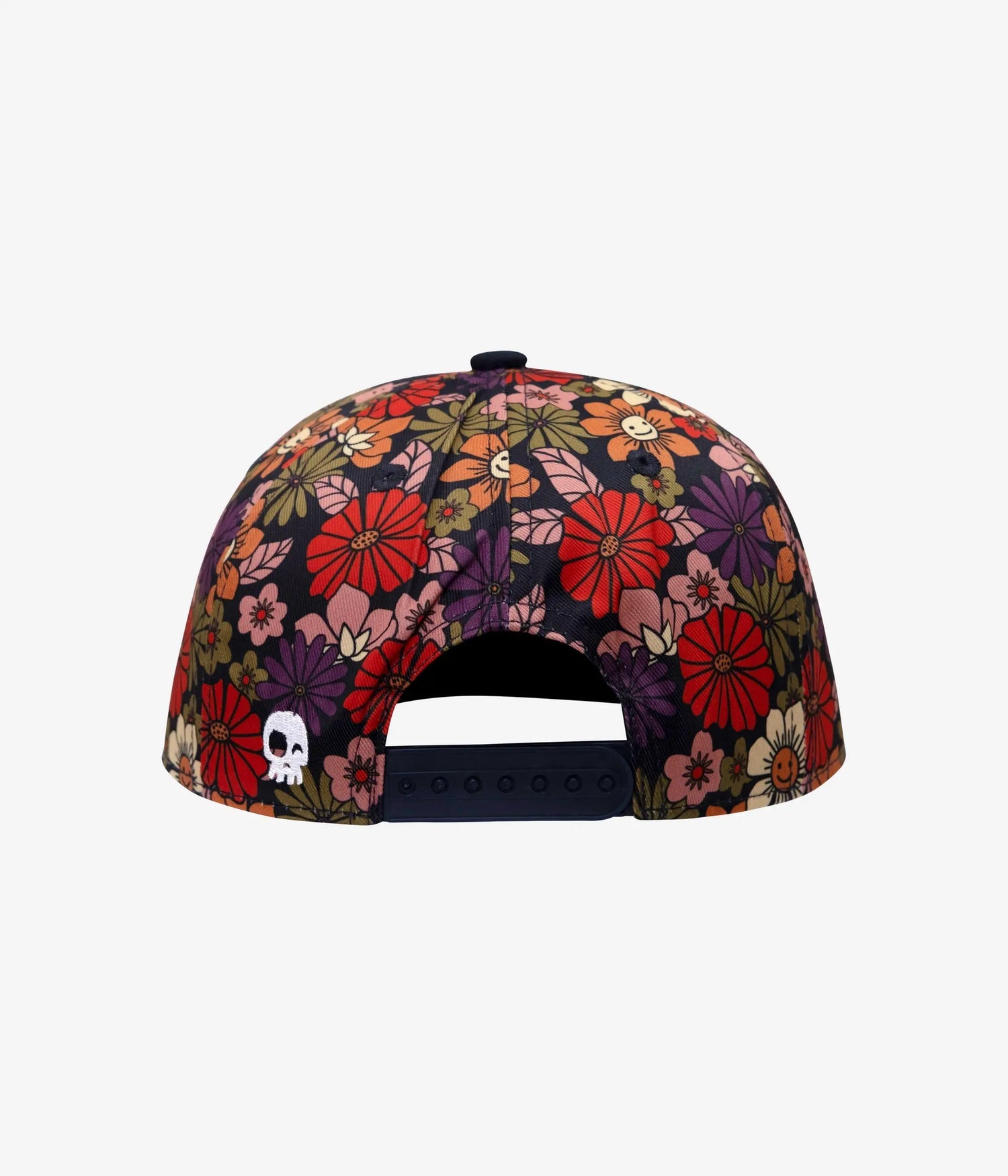 This hat features a vintage inspired floral and smiley faces, everything we love at Headster Kids.