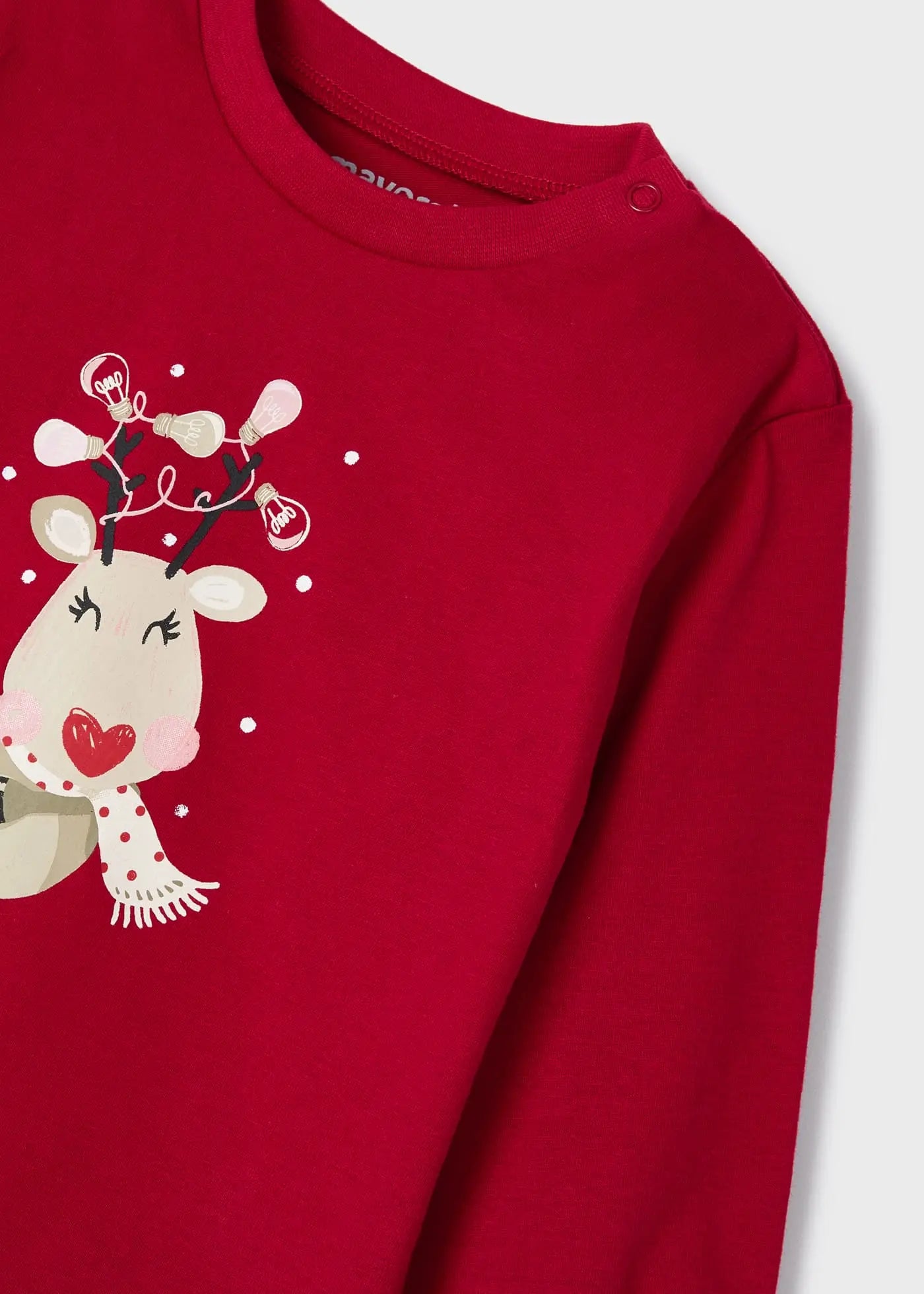 Long sleeved T-shirt for baby. Snap-button fastenings on the shoulder to allow the garment to be put on easily.