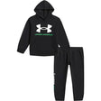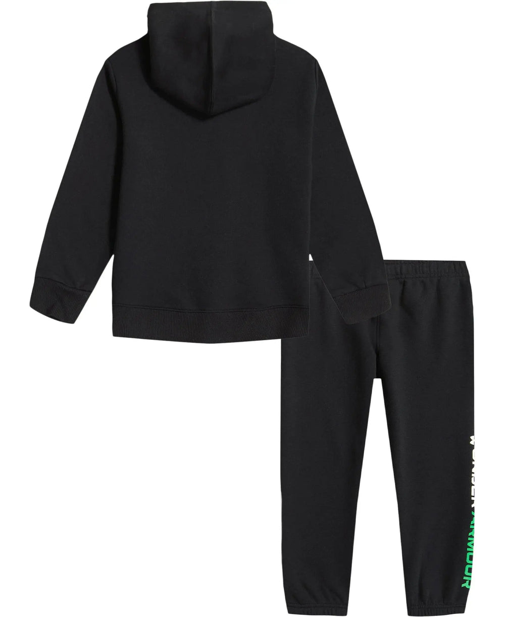 Made of soft fabric that quick dries and feels natural.  Bold in black with the classic front UA logo in a nice white with green.  A comfortable hood and kangaroo pocket make this a classic set.  Pull on joggers are pure comfort with an elastic waist and cuffs.
